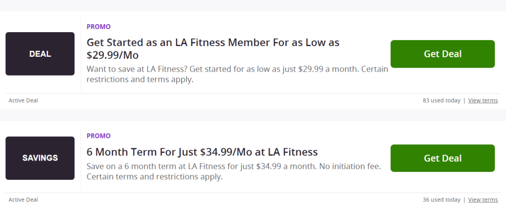 Promo codes found online or through apps can slash initiation fees. Sites like Groupon frequently list LA Fitness coupons for up to 20% off or $0 startup costs.